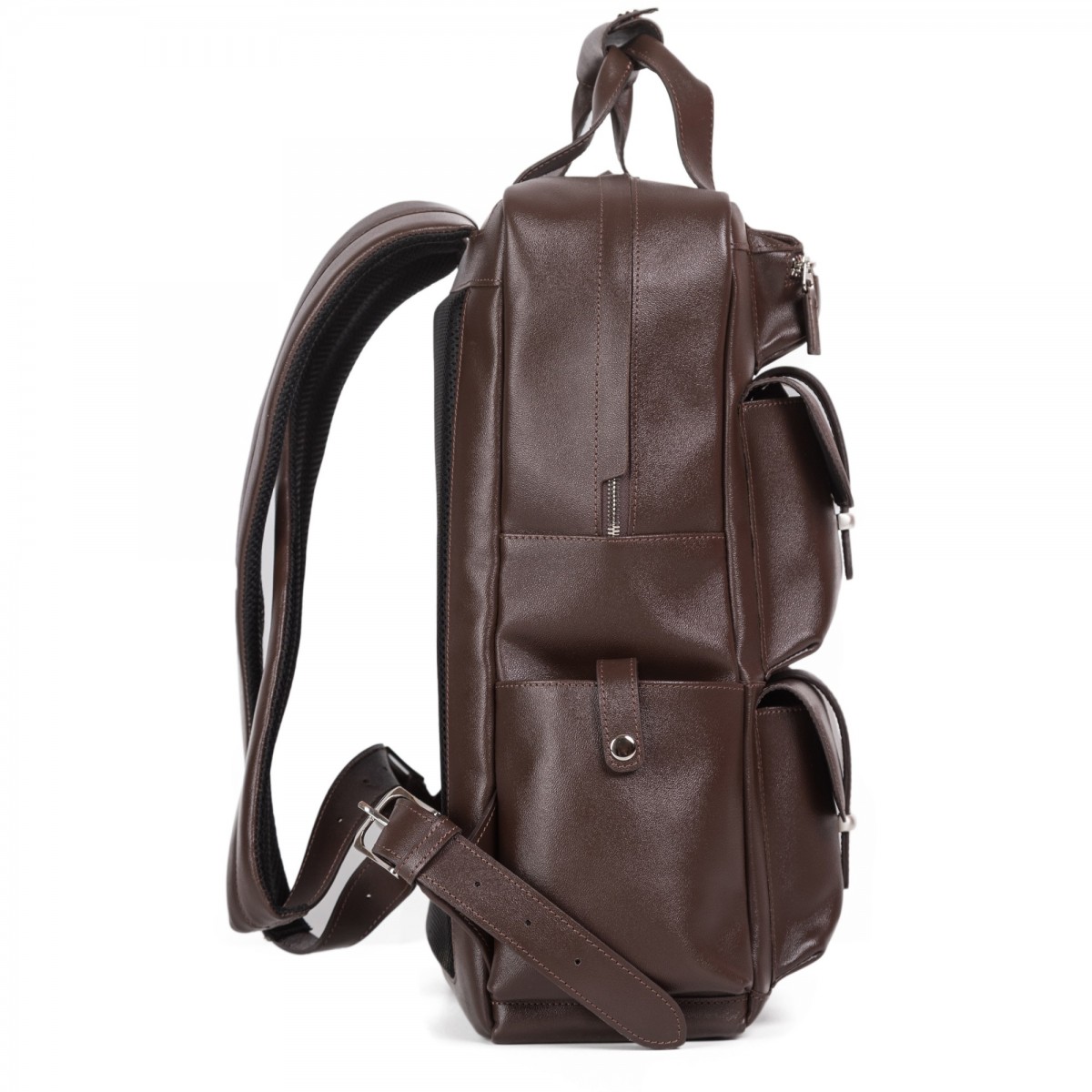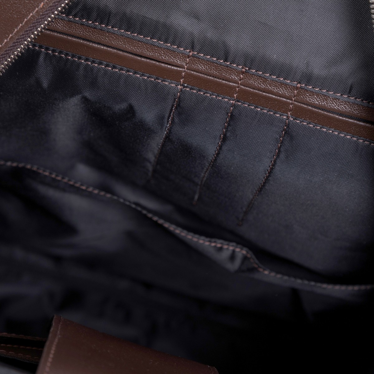 Изделие мягкой конструкции выворотное с уплотненной прокладкой дна. Изготовлено прошивным методом. Состоит из одного отделения, закрывающегося на застежку-молнию. Внутри уплотненные карманы для ноутбука 15" и планшета 10” из велюра, закрывающиеся клапаном, карман-органайзер с кантами и плоский открытый карман. На передней стенке пять объемных карманов, два закрываются на молнии, три клапанами и хлястиками на магниты и шлевки. По бокам два открытых кармана, застегивающихся хлястиками на кнопки. Изделие имеет две короткие ручки с обтяжкой, застегивающейся на две кнопки, а также два регулируемых по длине плечевых ремня. Ортопедическая накладка на задней стенке и плечевые ремни с внутренней стороны уплотнены и закрыты гигроскопичным вентилируемым материалом.