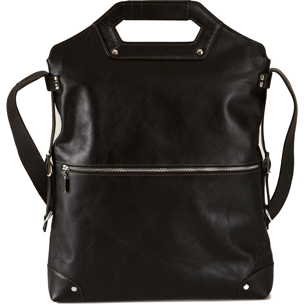 Сумка-рюкзак предполагает целых три (!) варианта ношения – да-да, и это не опечатка! При необходимости – полноценная деловая сумка, удобство ношения которой в течение дня обусловлено наличием плечевого ремня и его альтернативы – коротких уплотненных ручек. При этом внутреннее отделение успешно вместит в себя ноутбук или планшет. В случае если Вы являетесь приверженцем активного образа жизни, выбираете стиль кэжуал в одежде и постоянно заняты – легким движением руки, как заявлял небезызвестный персонаж в культовом фильме, сумка трансформируется в рюкзак. Однако в нашем случае этот процесс проходит без эксцессов, и Вы действительно становитесь обладателем современного делового рюкзака из натуральной кожи, который претерпевает такое превращение путем перестегивания ремня. Все Ваши девайсы, включая портативный компьютер и планшет, также помещаются в рюкзаке-трансформере.