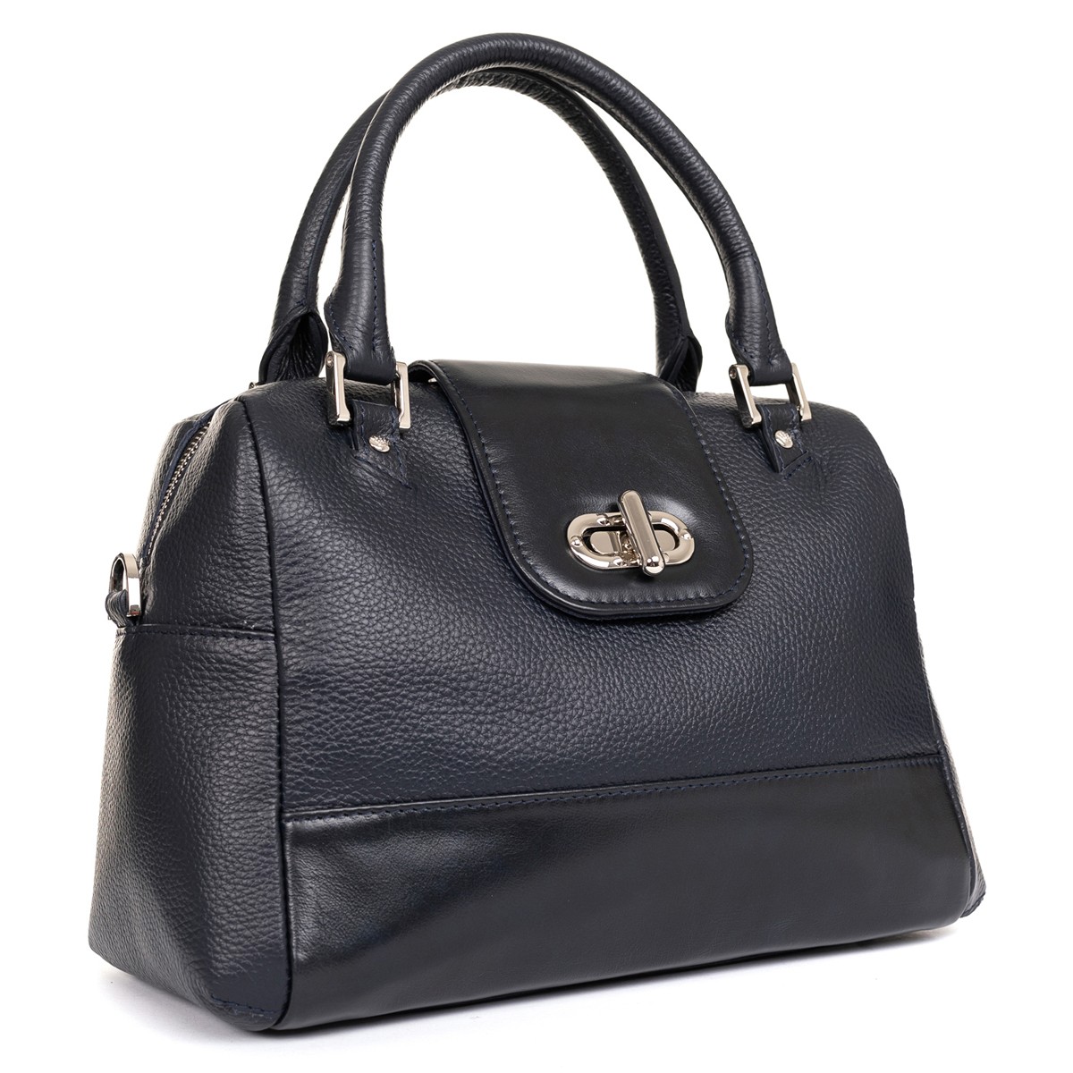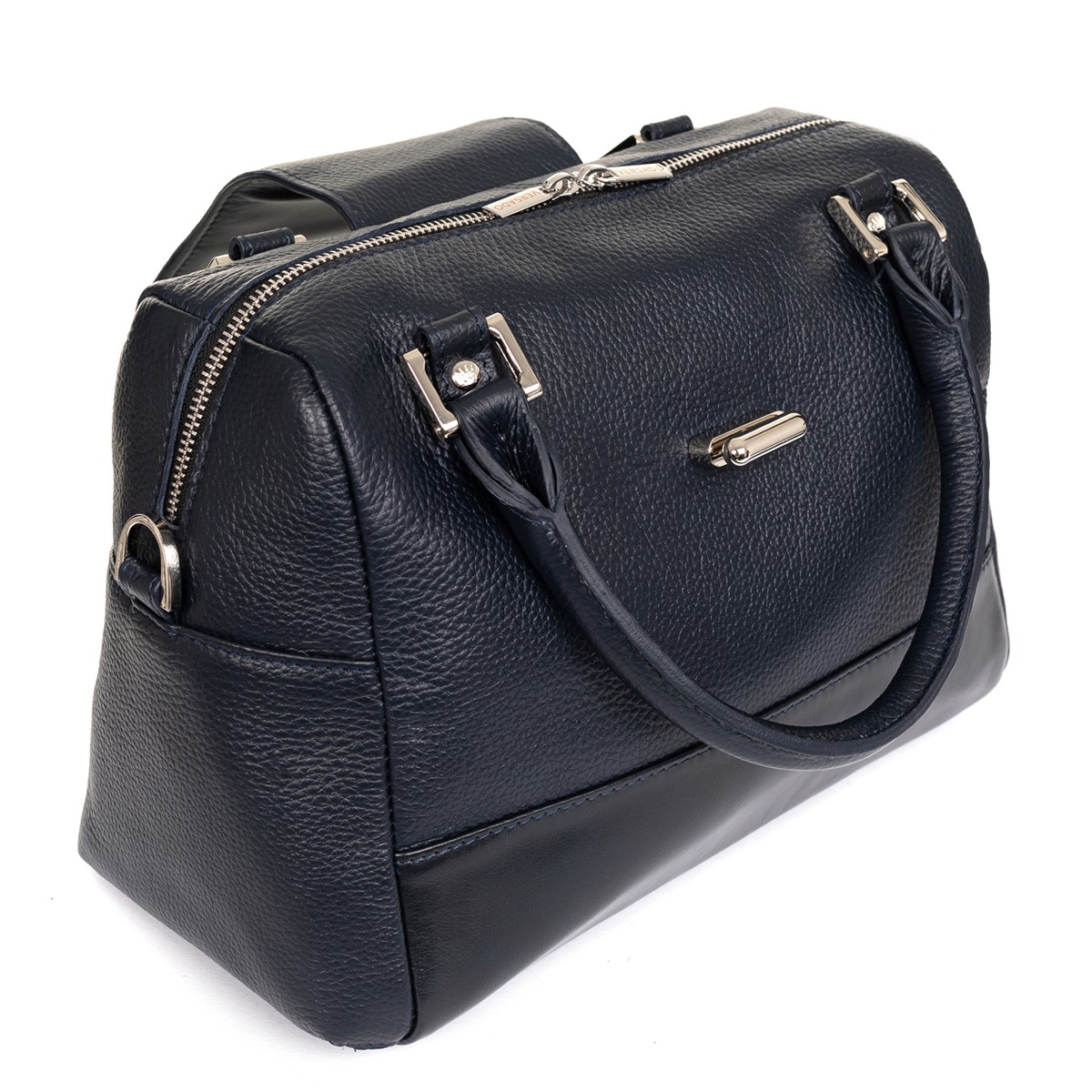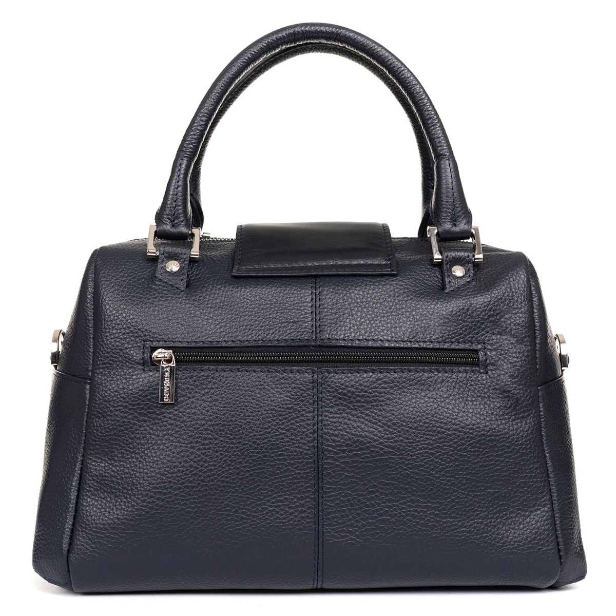 Изделие мягкой конструкции выворотное с жесткой прокладкой дна. Изготовлено прошивным методом. Состоит из одного отделения, закрывающегося молнией и клапаном на поворотный замок. Передняя и задняя стенки разрезные. На задней стенке прорезной карман на молнии. Внутри подвесной карман на молнии и накладной карман-органайзер. Изделие имеет две уплотненные короткие ручки и съемный регулируемый по длине плечевой ремень на карабинах.
