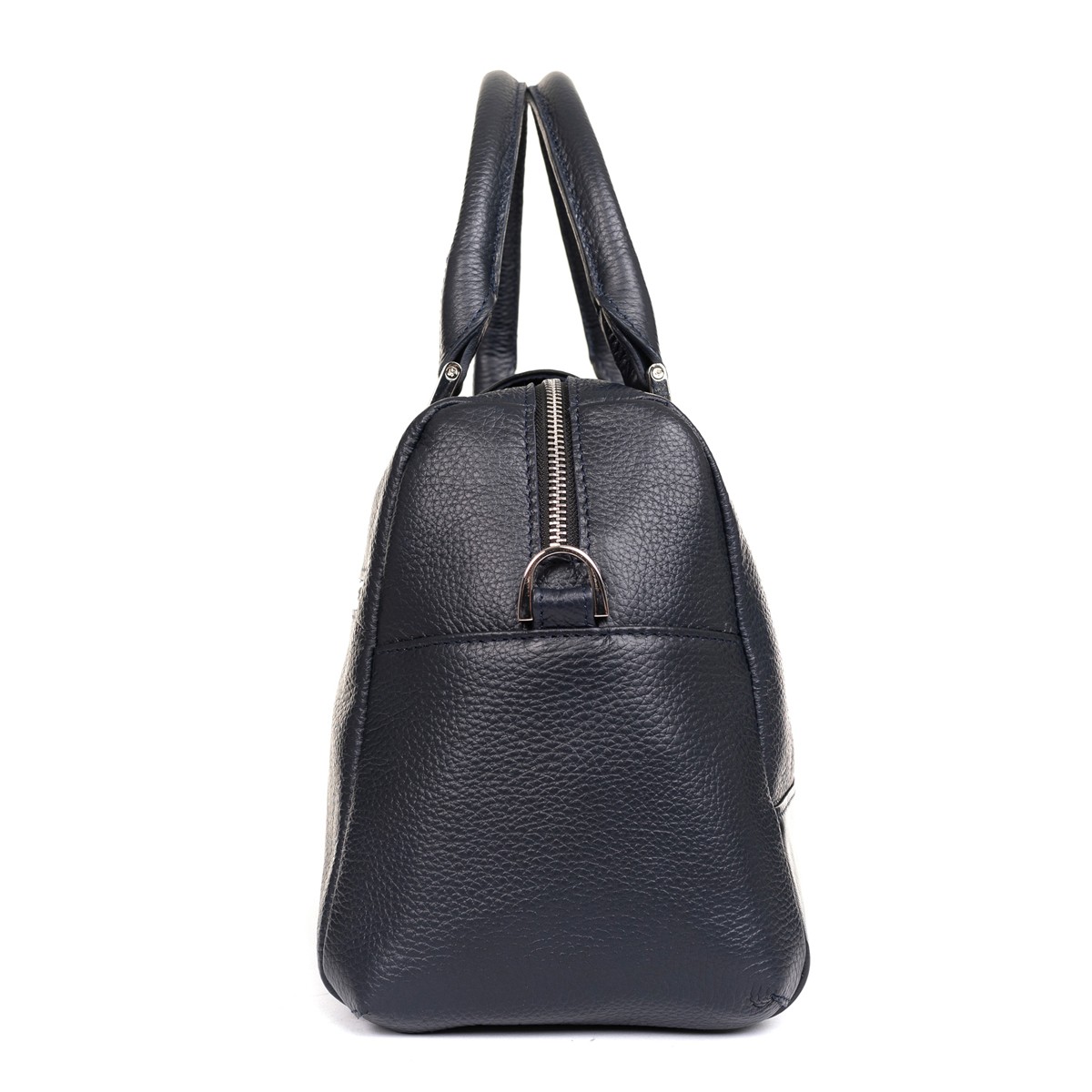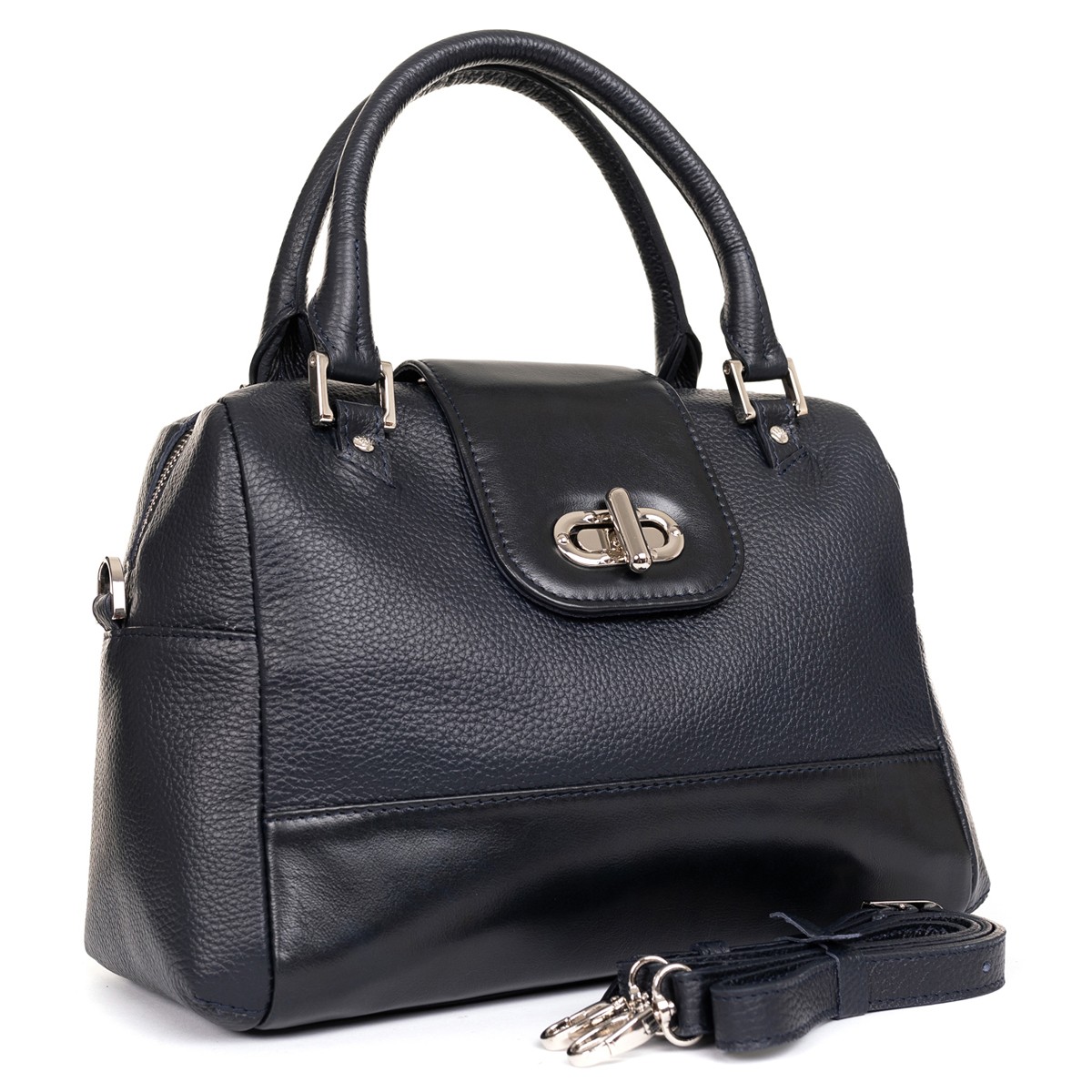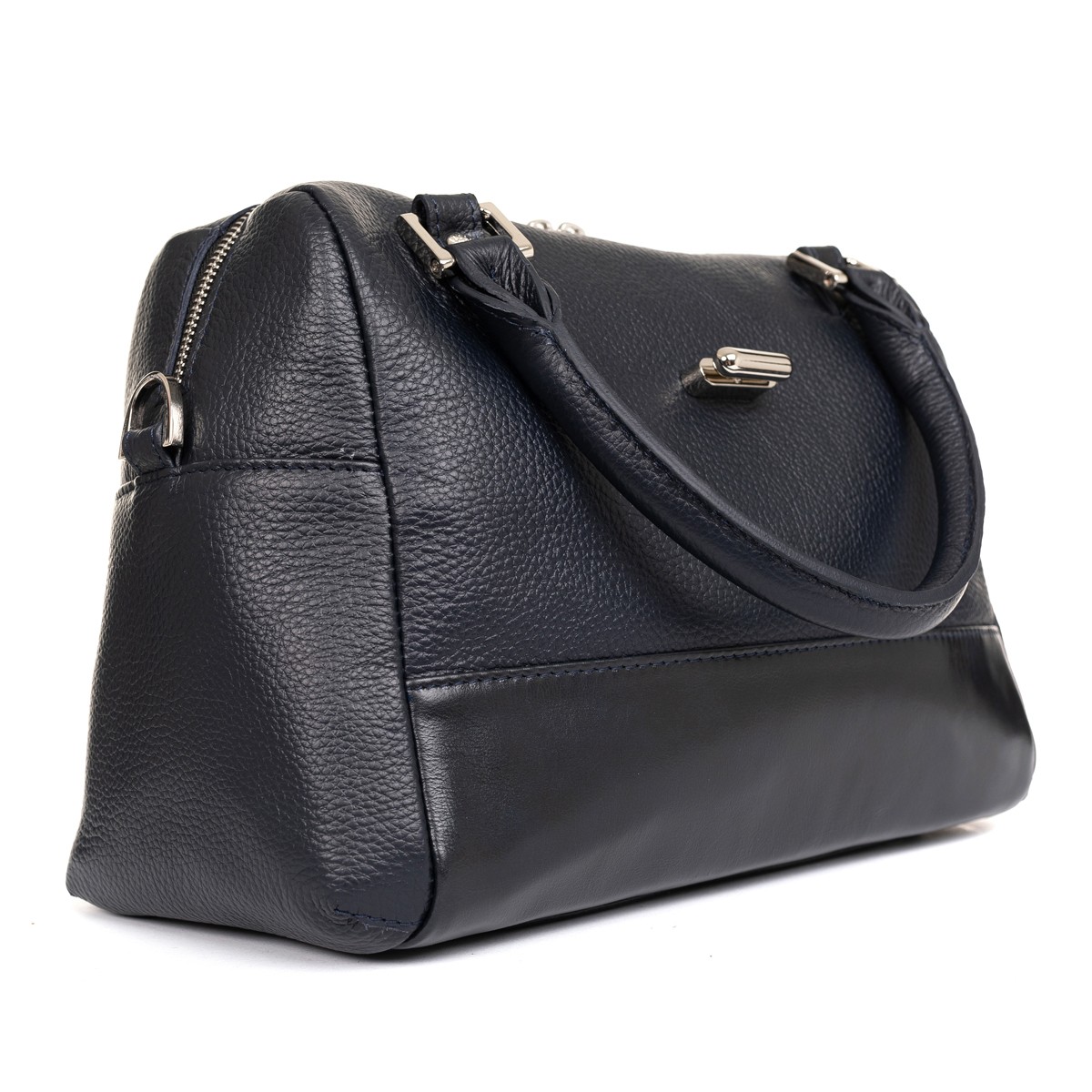 Изделие мягкой конструкции выворотное с жесткой прокладкой дна. Изготовлено прошивным методом. Состоит из одного отделения, закрывающегося молнией и клапаном на поворотный замок. Передняя и задняя стенки разрезные. На задней стенке прорезной карман на молнии. Внутри подвесной карман на молнии и накладной карман-органайзер. Изделие имеет две уплотненные короткие ручки и съемный регулируемый по длине плечевой ремень на карабинах.